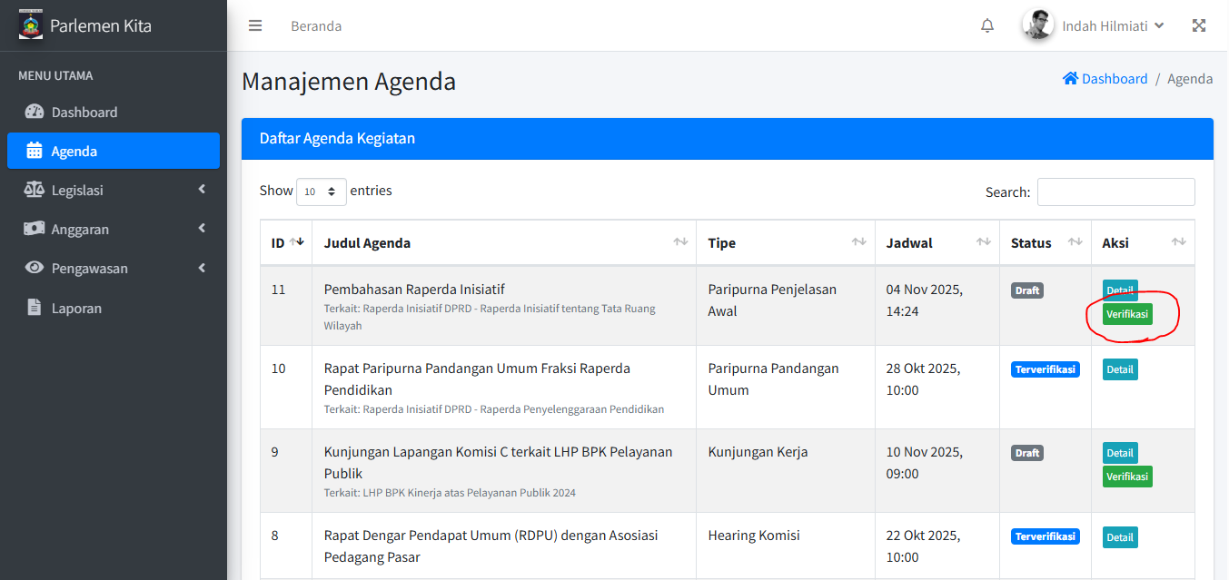 Jika agenda sudah "Terverifikasi" atau "Selesai", tombol Edit akan hilang dan Anda tidak bisa mengubahnya lagi untuk menjaga integritas data.