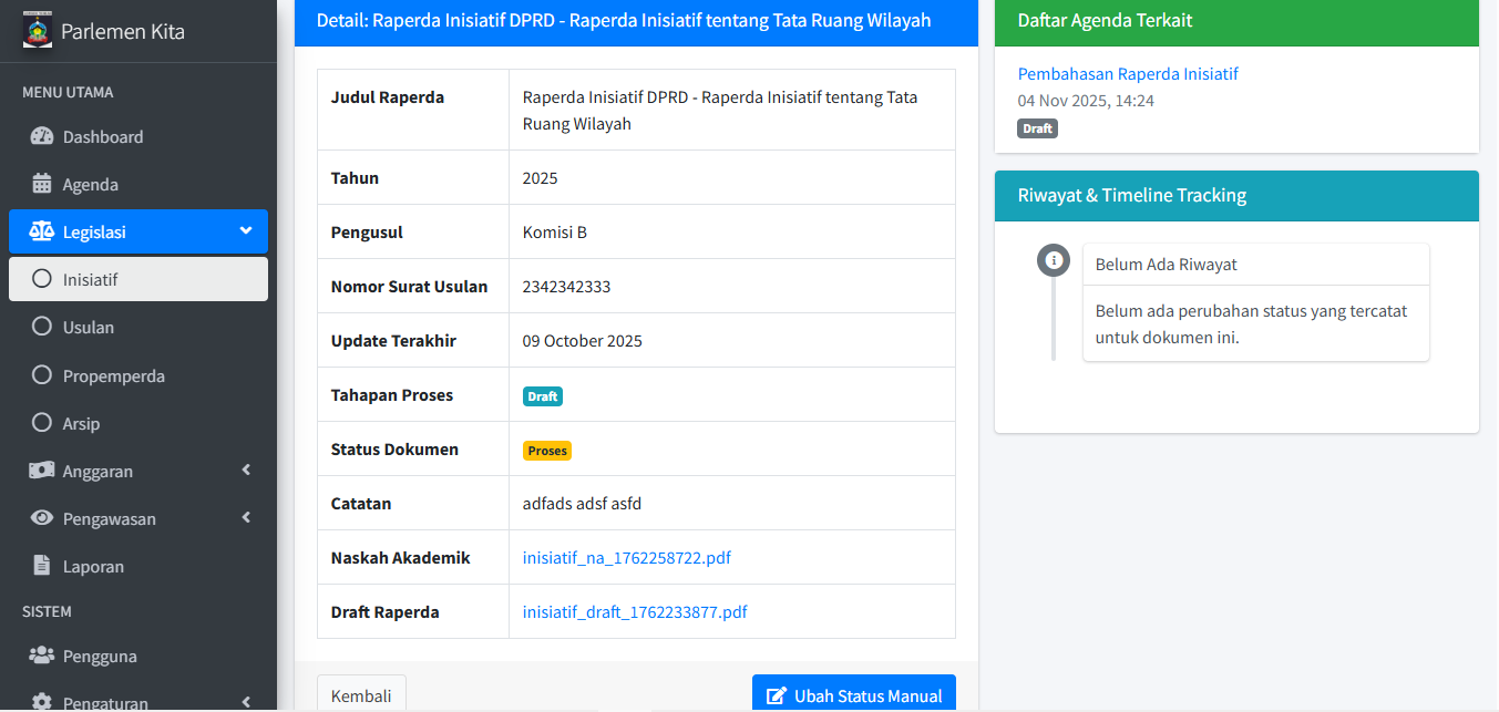 Modul ini (beserta Anggaran & Pengawasan) adalah inti dari aplikasi untuk melacak progres dokumen. Alur kerja untuk ketiga sub-menu (Inisiatif, Usulan, Propemperda) pada dasarnya sama.