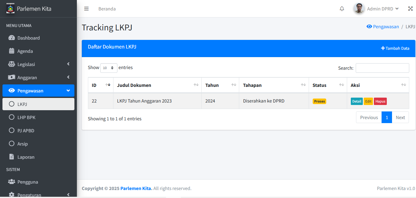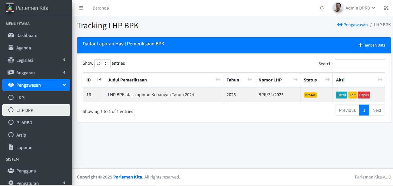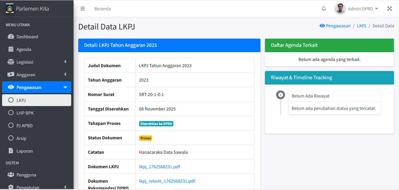 Modul ini melengkapi fungsi tracking aplikasi, dengan fokus pada dokumen pengawasan. Alur kerjanya sama persis dengan Modul Legislasi dan Anggaran.