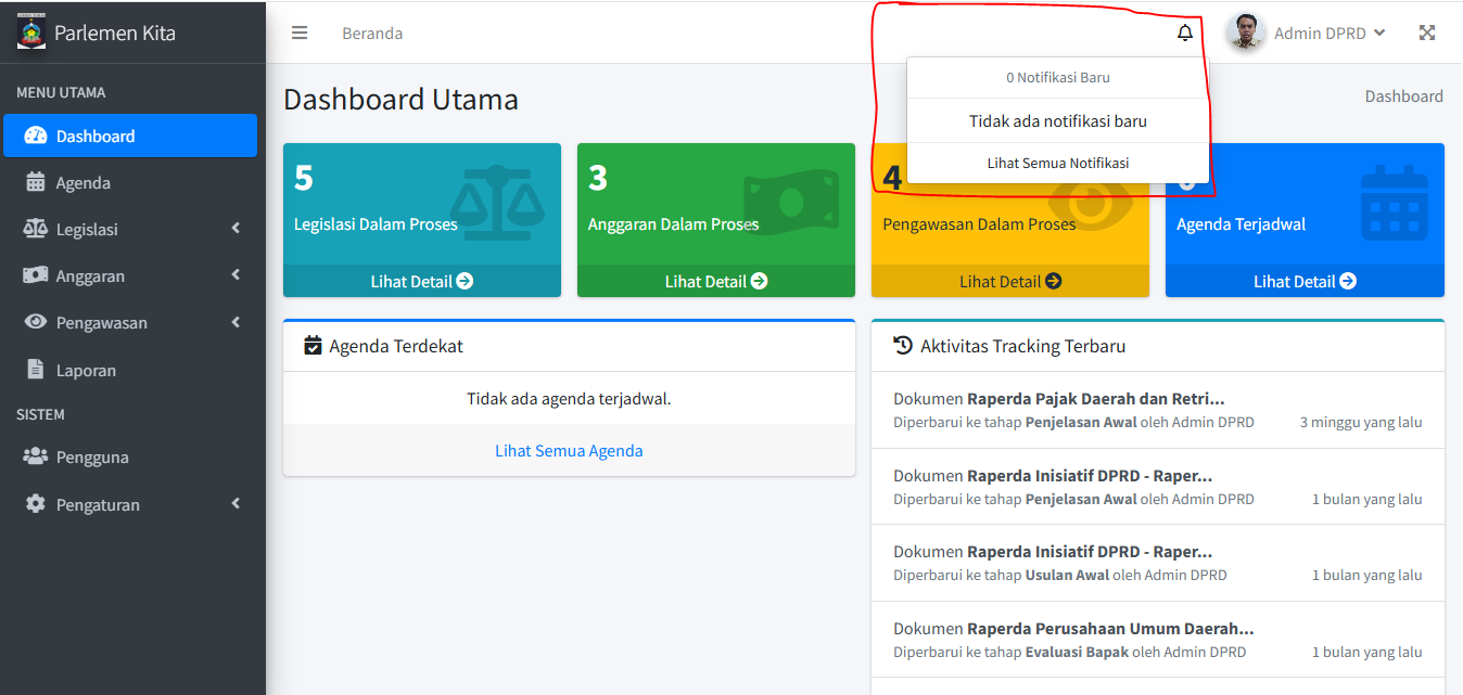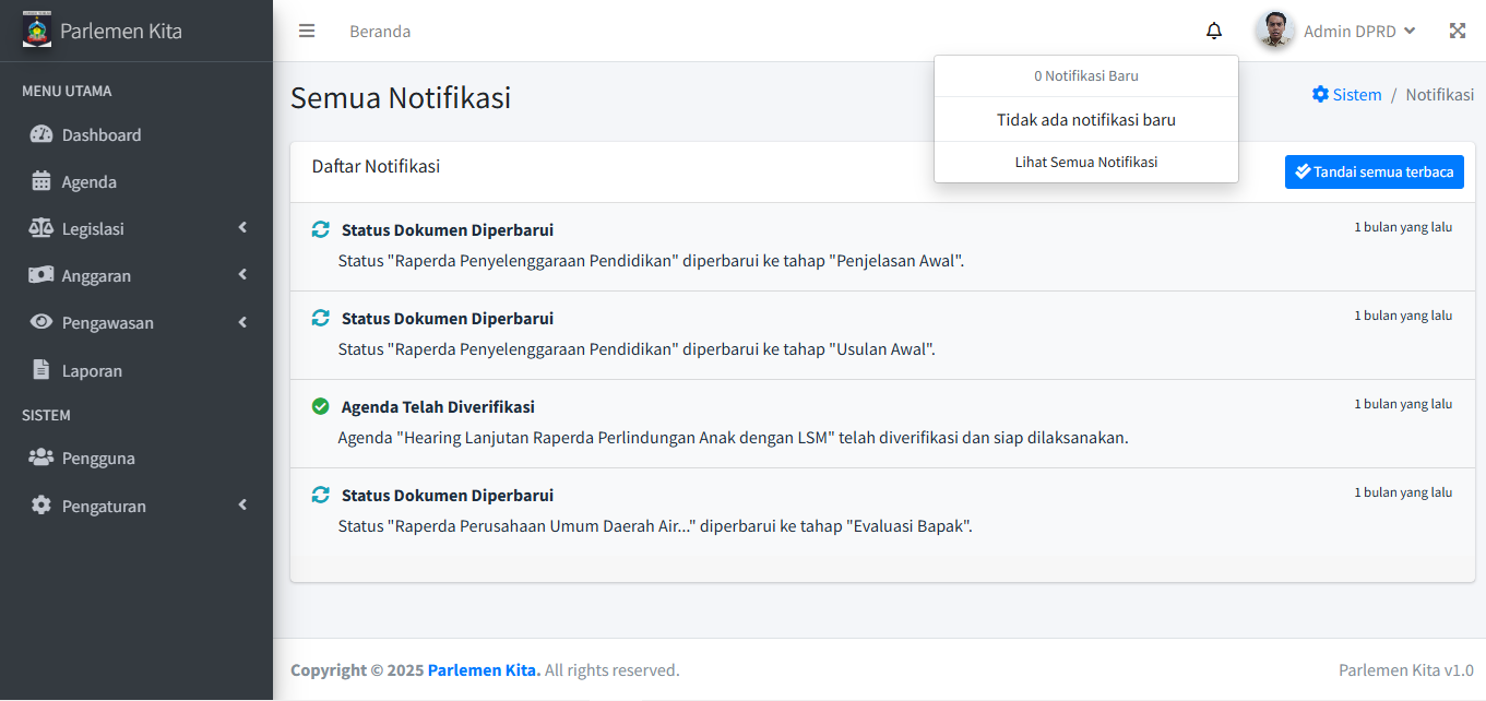 Sistem akan memberi Anda notifikasi untuk hal-hal penting (misal: Agenda baru, Agenda diverifikasi).