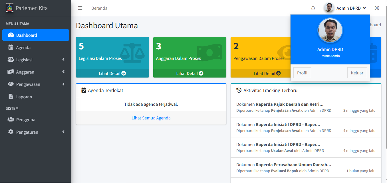 PENTING: Jika agenda ini tertaut ke Dokumen (dari langkah 2.1), status dokumen tersebut akan otomatis ter-update. (Misal: Menyelesaikan agenda "Paripurna Penjelasan Awal" akan mengubah status dokumen terkait menjadi "Penjelasan Awal"). Ini adalah inti dari sistem tracking.