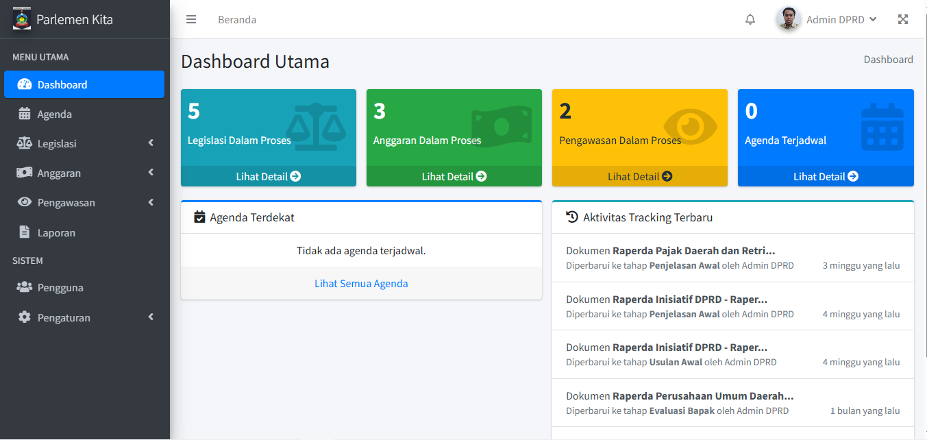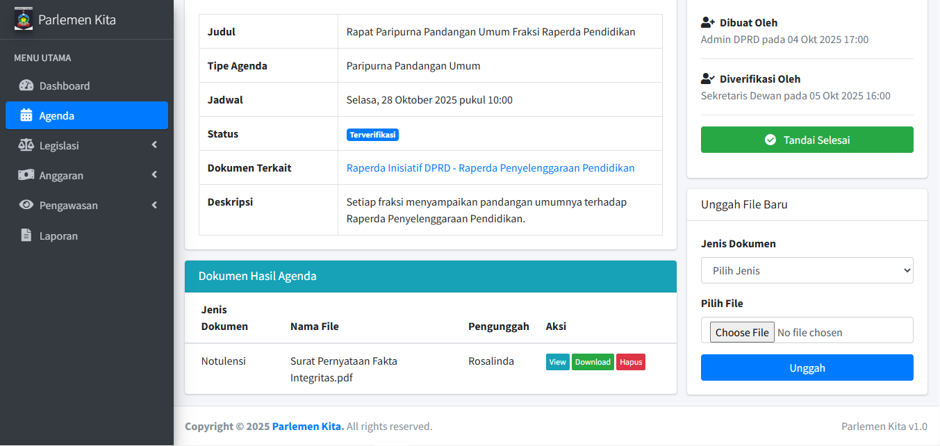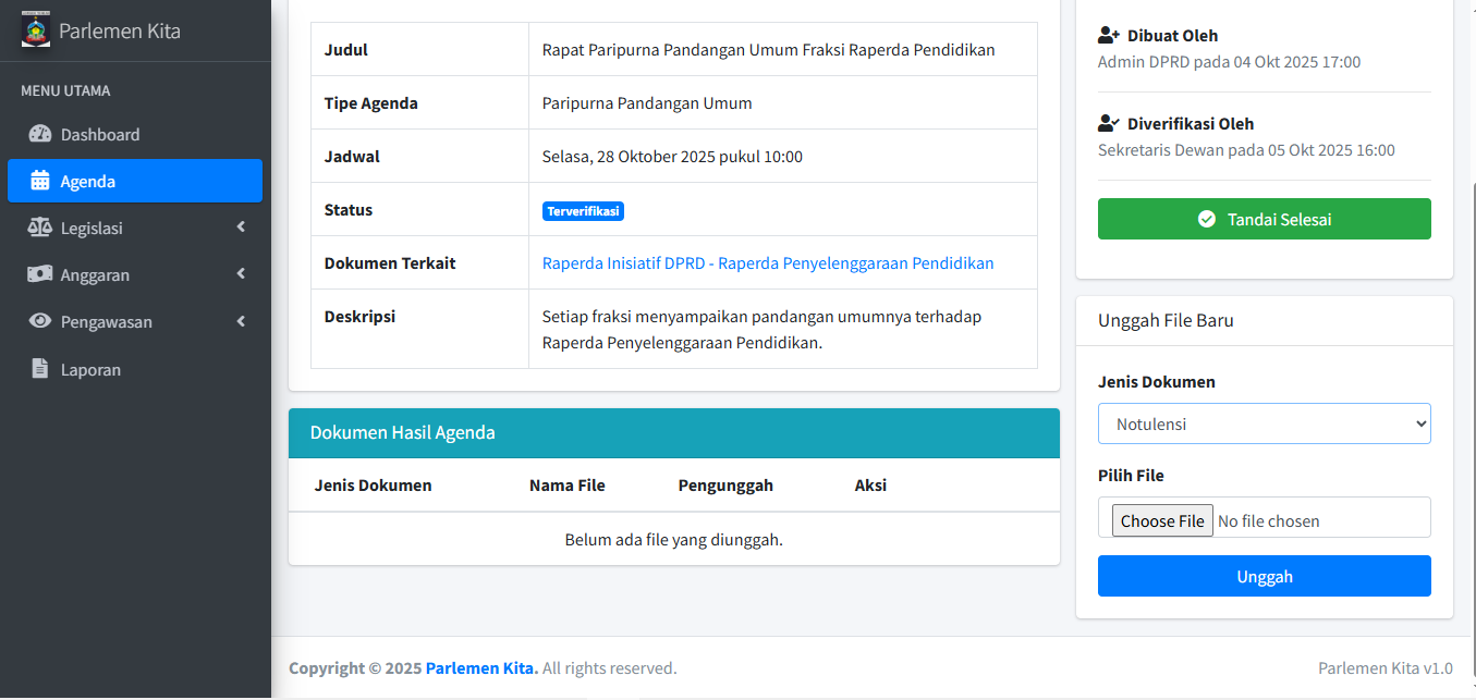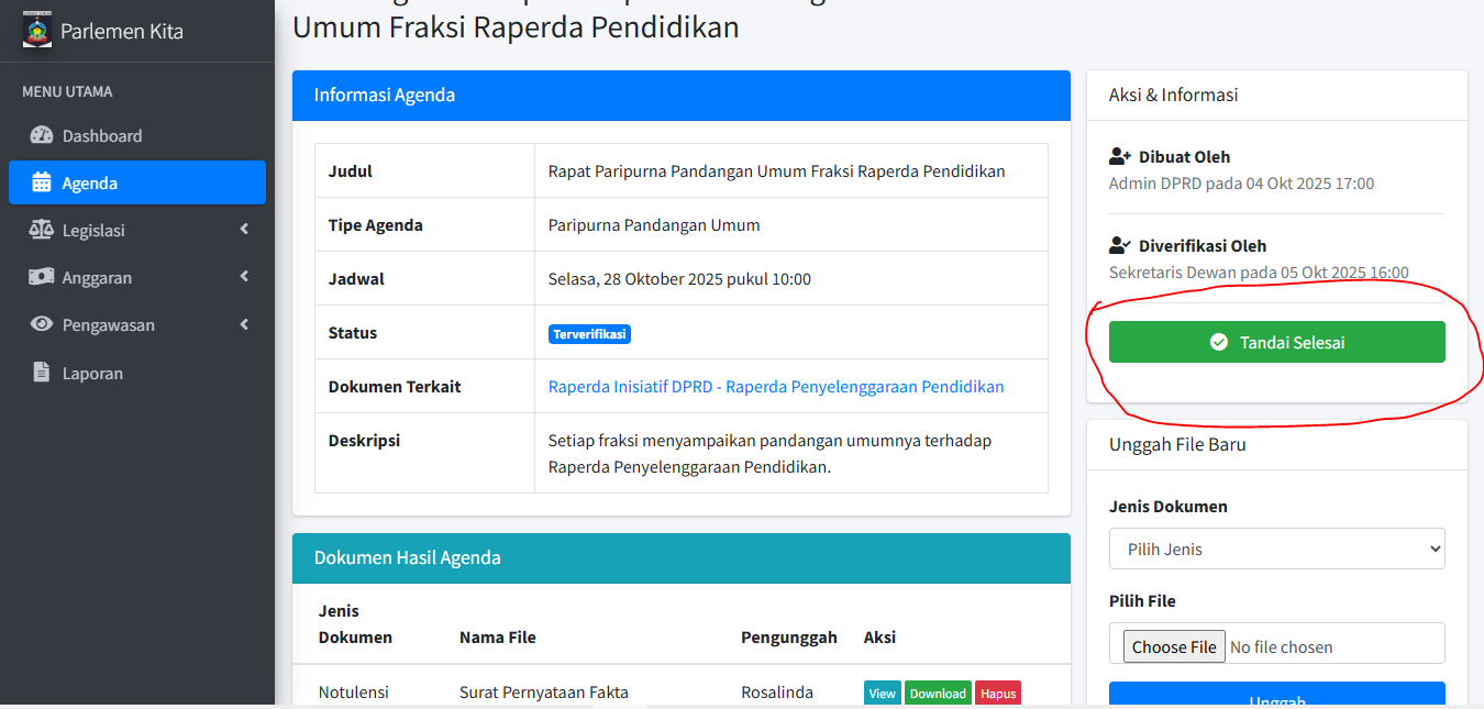 PENTING: Jika agenda ini tertaut ke Dokumen (dari langkah 2.1), status dokumen tersebut akan otomatis ter-update. (Misal: Menyelesaikan agenda "Paripurna Penjelasan Awal" akan mengubah status dokumen terkait menjadi "Penjelasan Awal"). Ini adalah inti dari sistem tracking.