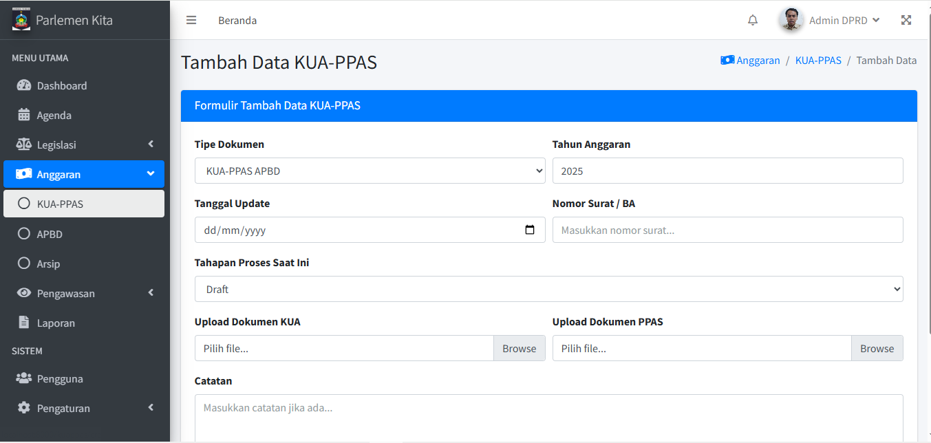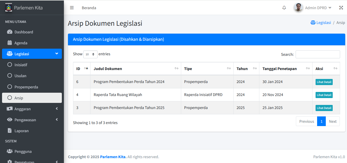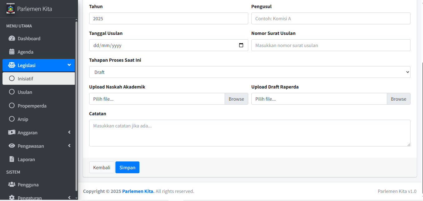 Langkah-langkah untuk menu "Legislasi > Usulan" dan "Legislasi > Propemperda" sama persis dengan Modul Inisiatif. Ulangi langkah 3.1 s/d 3.5 untuk kedua modul tersebut.