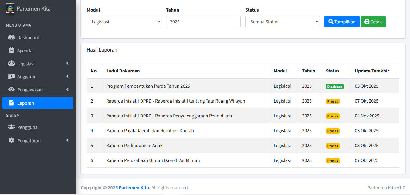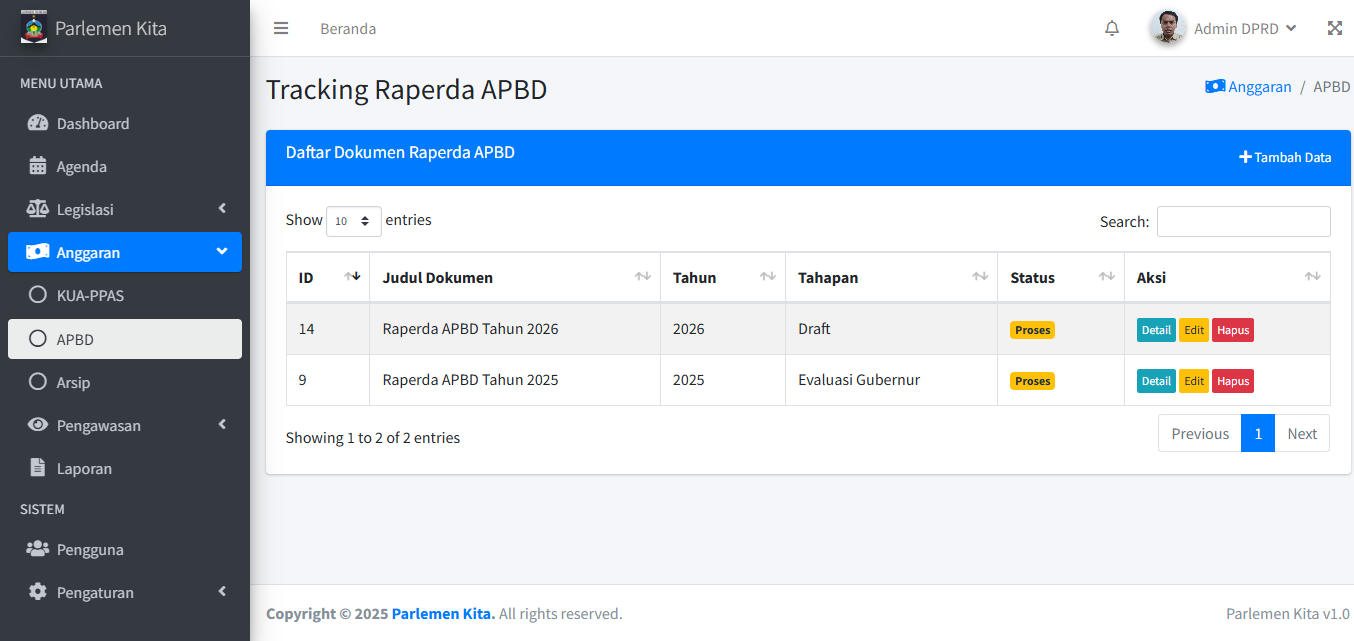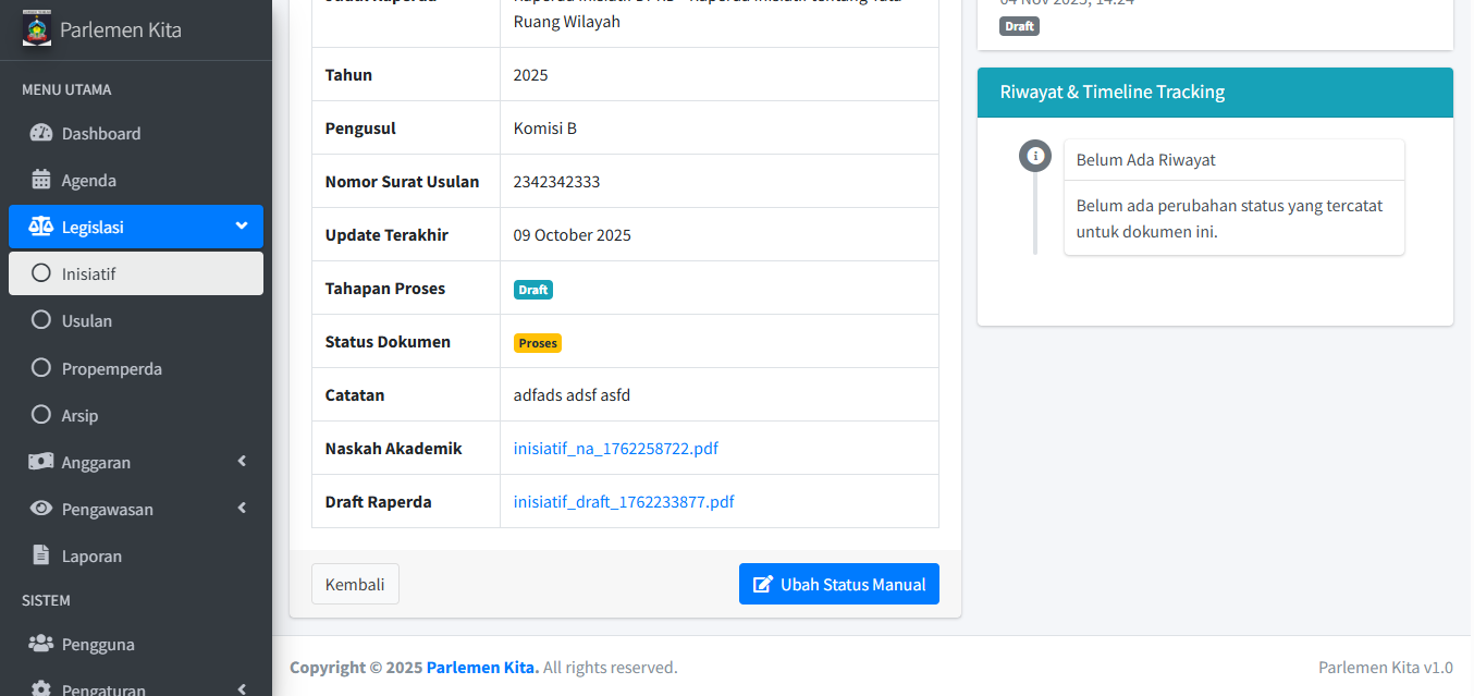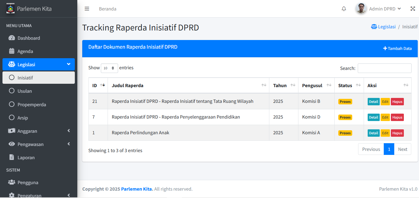 Modul ini (beserta Anggaran & Pengawasan) adalah inti dari aplikasi untuk melacak progres dokumen. Alur kerja untuk ketiga sub-menu (Inisiatif, Usulan, Propemperda) pada dasarnya sama.