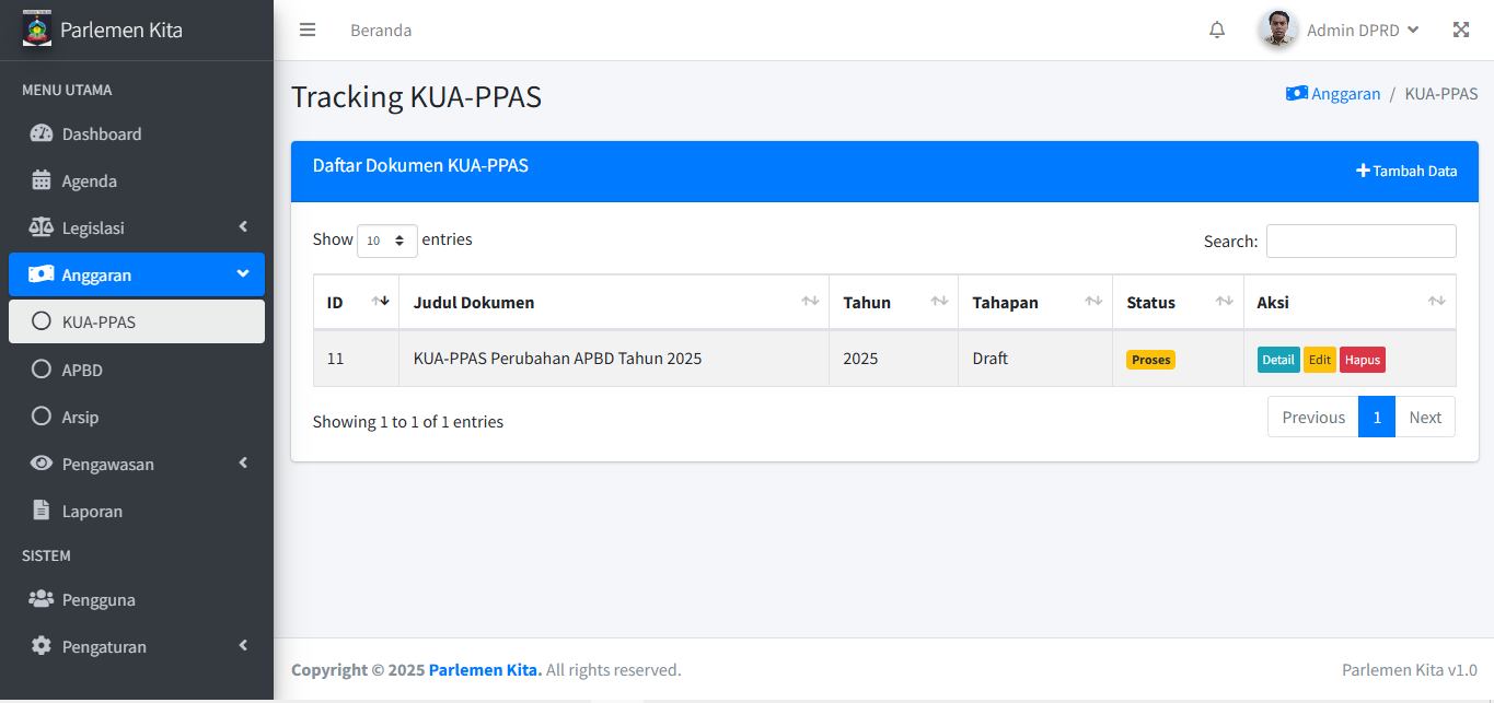 Alur kerja modul ini identik dengan Modul Legislasi, yaitu untuk menambah, melacak, dan mengarsipkan dokumen terkait anggaran.