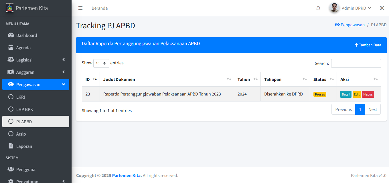 Modul ini melengkapi fungsi tracking aplikasi, dengan fokus pada dokumen pengawasan. Alur kerjanya sama persis dengan Modul Legislasi dan Anggaran.