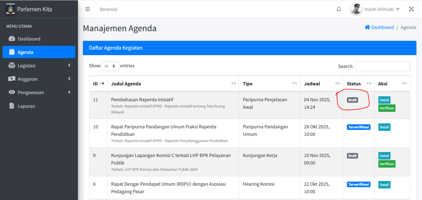Jika agenda sudah "Terverifikasi" atau "Selesai", tombol Edit akan hilang dan Anda tidak bisa mengubahnya lagi untuk menjaga integritas data.